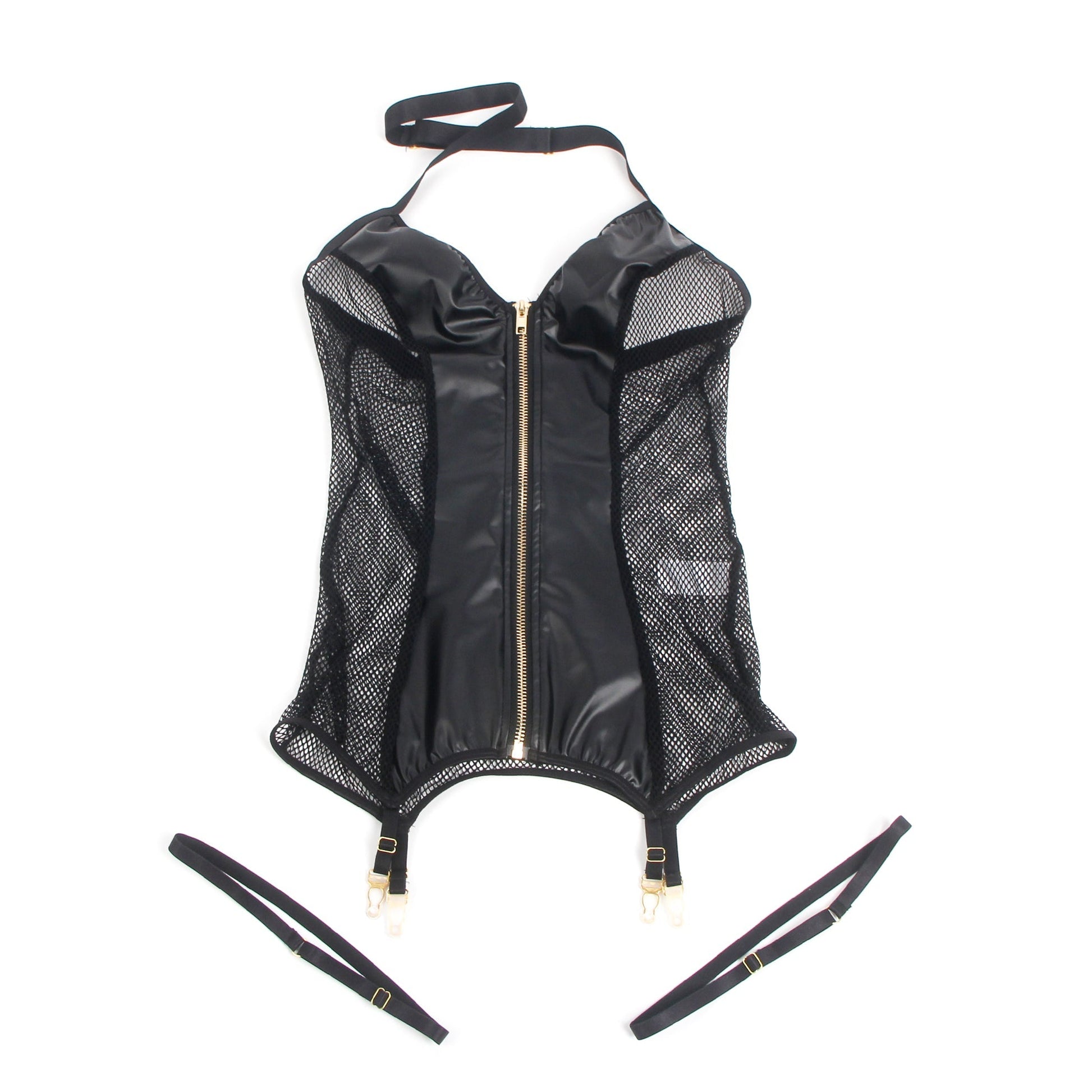 Verander elke blik in verlangen met Selene Allure™ Leren Lingerie, een adembenemende fusie van glanzend faux leer en doorschijnende mesh verleiding. Ontworpen met een gedurfde crisscross halterhalslijn en een lichaamcontourerende ritssluiting aan de voorkant, flatteert dit stuk je silhouet terwijl het een gedurfde, zelfverzekerde uitdrukking van sensualiteit biedt. Perfect voor degenen die zowel elegantie als aantrekkingskracht in gelijke mate verlangen.
